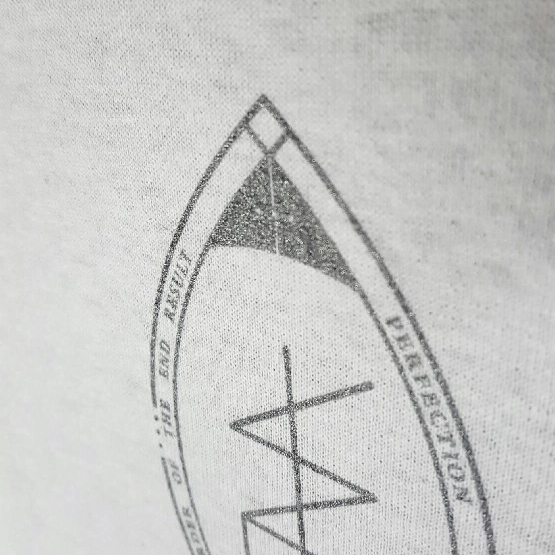 Silver shimmer print onto white, Gildan 5000 model t-shirts. 5.3 oz, 100% pre-shrunk cotton construction. Double-needle stitched neckline, bottom hem, and sleeves. with seven-eighths inch seamless collar. Printed by Jeff Bolt at Soft Hand Screen Printing.